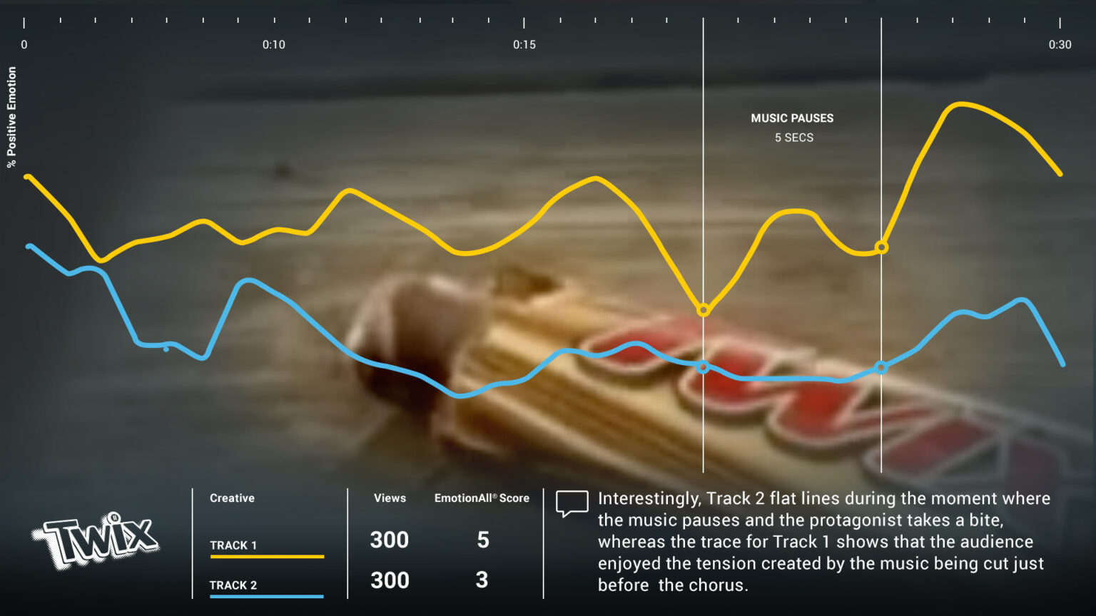 Mars Inc. wanted to know how the choice of soundtrack to an ad might affect its impact on the audience – so we ran a small study with an old Twix ad to find out.