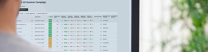 The score measures human attention (eyes on screen) and emotions (facial expressions) in response to creative content through first-party webcam studies. Built from 336 billion+ frames of viewing time mapped to attention and emotion data, collected from over 90,000 video ads and 18 million human participants. Â
