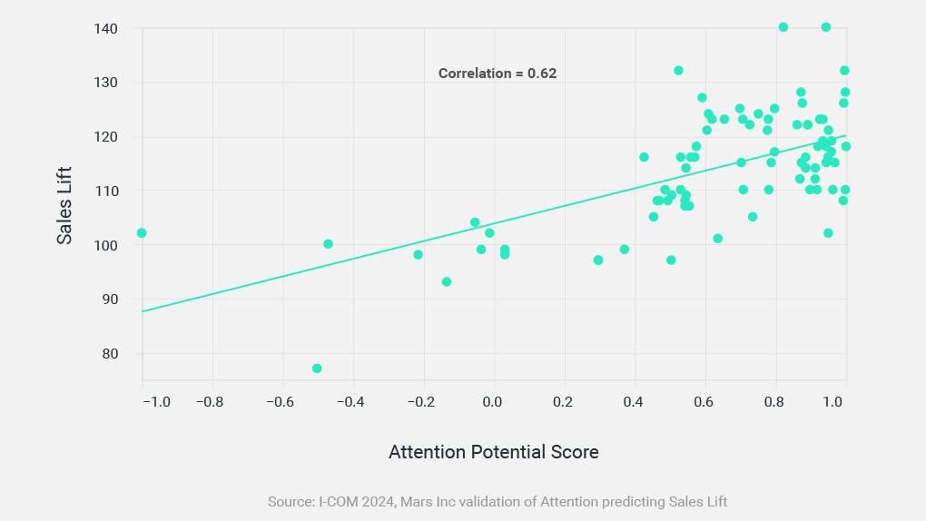 Realeyes created the Attention Potential Score to provide greater context to an advertisement’s quality. It is a 0 –100 predictive rating that estimates how likely an ad is to drive sales. Mars for example has seen a 0.62 correlation between Attention Potential score and Sales – resulting in an 3-5% Sales Lift. Â