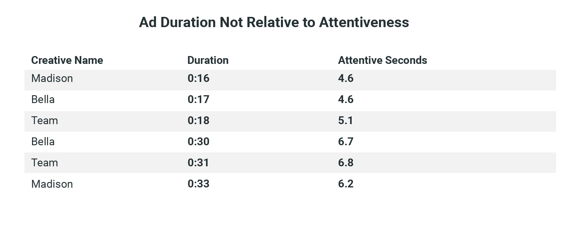 However, they did at a near-equal or lower percentage compared to their increased run time. The greatest difference in similar creative were the ones that featured Bella, whose 30-second version had 46% increase in attentive seconds while representing an 76% increase in time.
