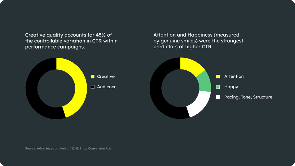 To answer this question, Adverteyes conducted one of the most comprehensive creative effectiveness studies in performance advertising history. We analyzed 12,600 performance-focused video ads, measuring them across multiple dimensions: attention capture, emotional response, and a sophisticated array of content signals including branding strength, visual pacing, narrative structure, and storytelling techniques. These rich creative data points were then modeled against real-world performance metrics, specifically, the click-through rates (CTR) these ads generated on Snapchat.